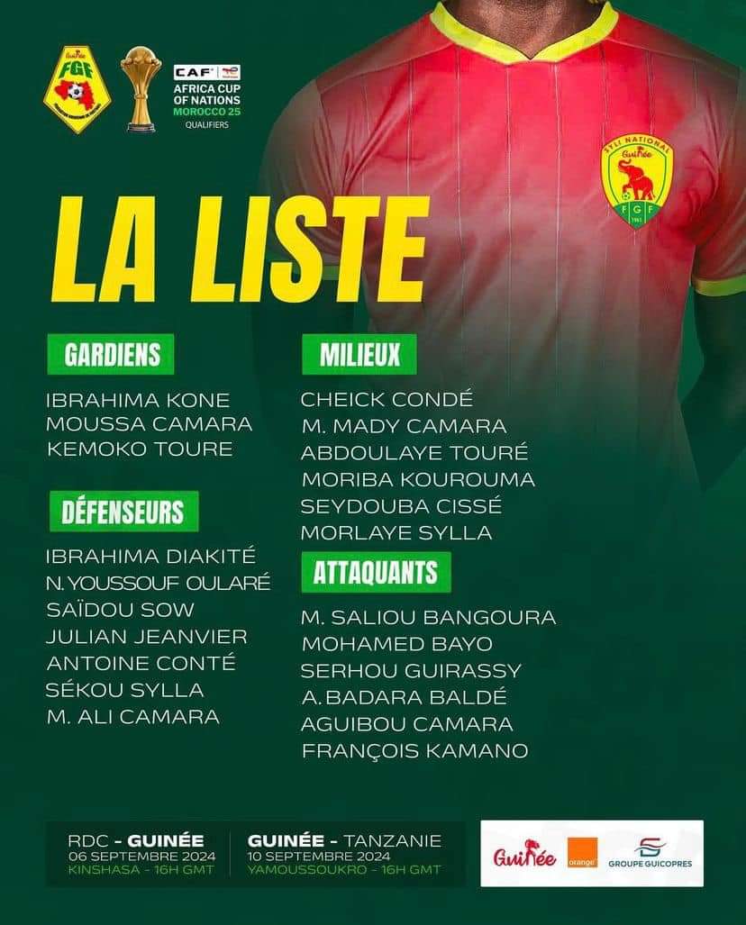 CONAKRY- L’ère Kaba Diawara est tournée et le nouveau sélectionneur du Syli Charlie Paquillé vient de donner sa première liste des joueurs convoqués pour la trêve internationale de septembre prochain. Pour affronter la RD Congo et la Tanzanie pour le début des éliminatoires de la CAN 2025 au Maroc, le nouveau patron du Syli a dévoilé l’identité des joueurs convoqués.