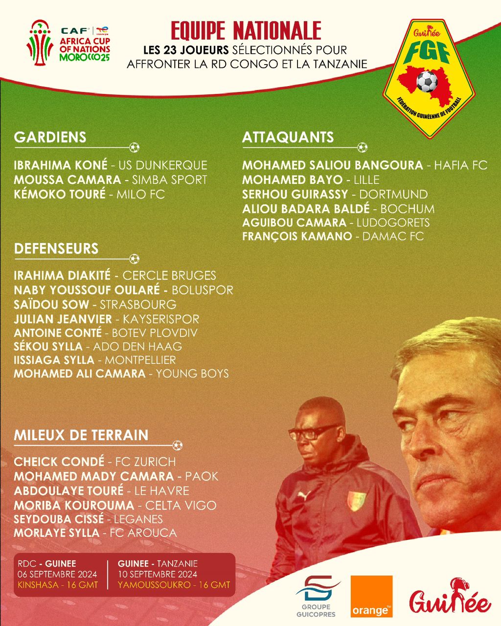 CONAKRY- La première liste après Kaba Diawara liste était scrutée par les observateurs et les supporters du Syli National. Celles-ci, minutieusement préparée par le tendem Paquillé-Dussuyer est tombée ce lundi soir et elle semble faire l’unanimité dans l’opinion. C’est en prévision des matches des éliminatoires de la CAN 2025 contre la RDC (6 septembre) et la Tanzanie (10 septembre).