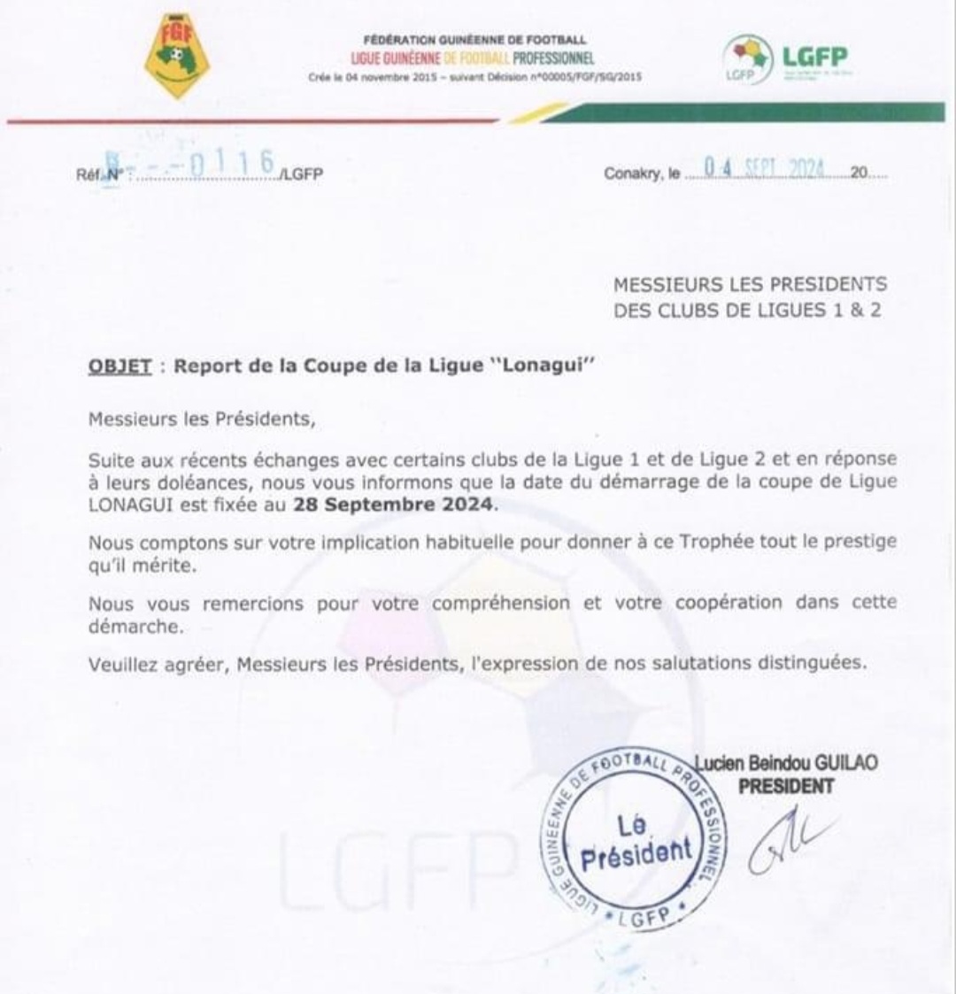 CONAKRY- La Ligue Guinéenne de Football Professionnel vient d’annoncer le report de la deuxième édition de la coupe de la Ligue. Censée démarrer ce samedi 7 septembre 2024, la compétition va connaître un léger réajustement.