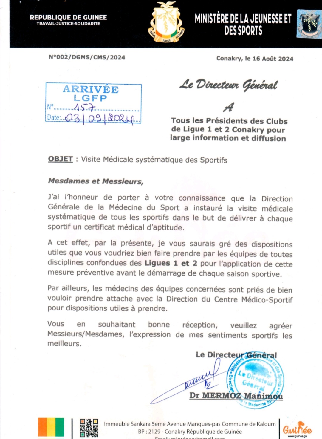 CONAKRY- C’est une première en Guinée. Dans une correspondance adressée aux clubs de Ligue 1 et ligue 2, la Direction Nationale de la Médecine du sport de Guinée annonce l’instauration de la visite médicale pour tous les sportifs des clubs de Ligue 1 et Ligue 2 avant le début de chaque saison sportive. Un exercice qui vise à s’enquérir de l’état de santé de tous les acteurs impliqués avant la nouvelle saison, pour prévenir les risques, peut-on en déduire.