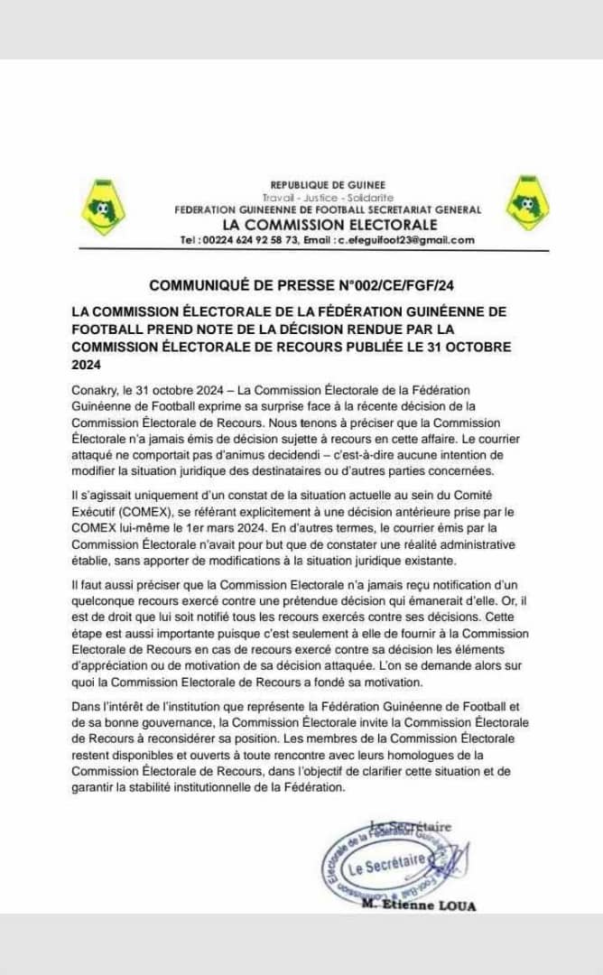 “La commission électorale de la fédération Guinéenne de Football exprime sa surprise face à la récente décision de la commission électorale de recours. Nous tenons à préciser que la commission électorale n’a jamais émis de décision sujette à recours en cette affaire. Il s’agit uniquement d’un constat de la situation actuelle au sein du comité exécutif se référant explicitement a une décision antérieure prise par le COMEX lui-même le 1er mars 2024. En d’autres termes, le courrier émis par la commission électorale n’avait pour but que de constater une réalité administrative établie, sans apporter de modifications à la situation juridique existante.