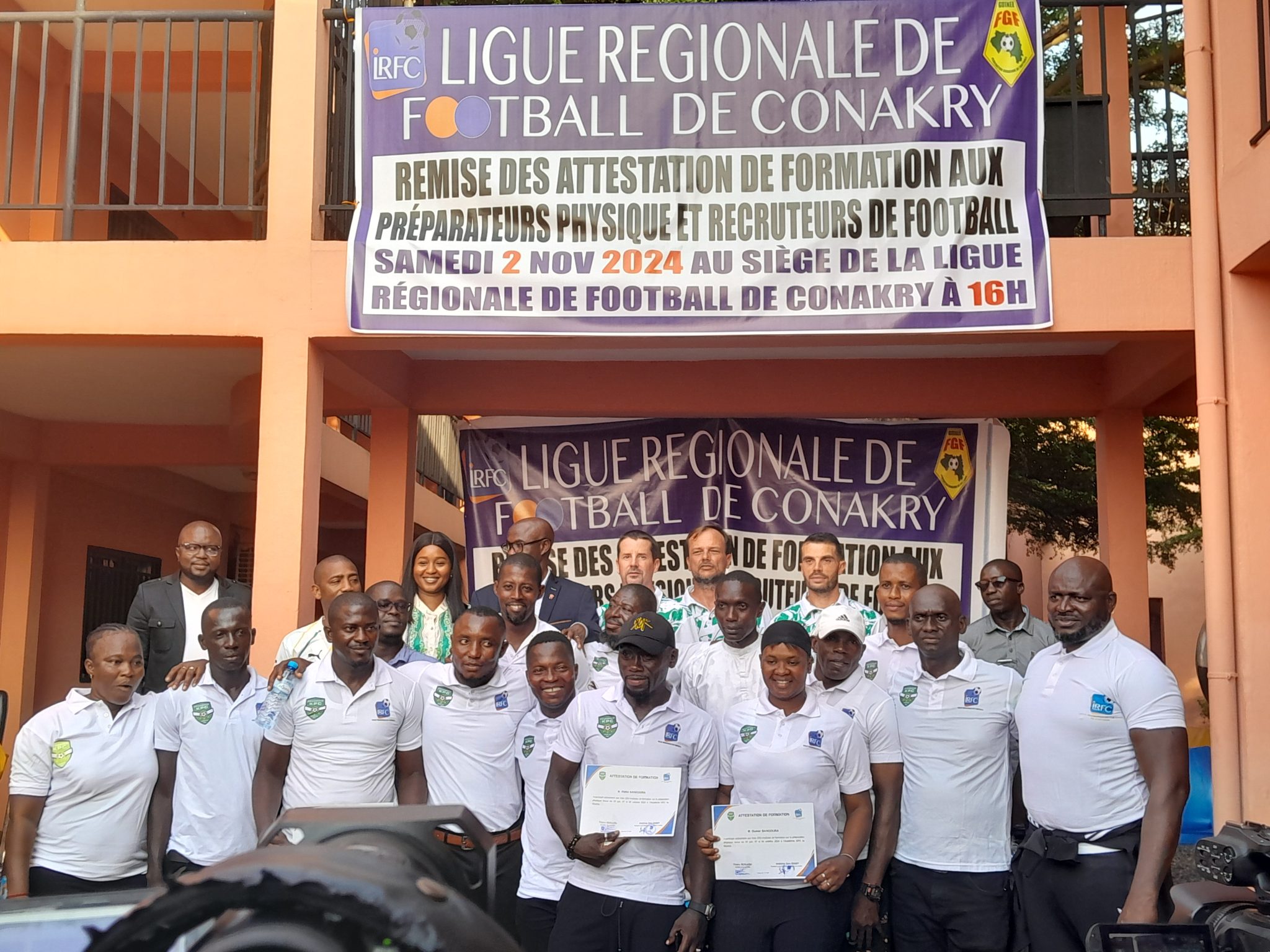Cette formation qui s’est tenue au à Khorira au sein de l’académie KPC, a regroupé des stagiaires désireux d’apprendre. Ce samedi, la Ligue régionale de football de Conakry a organisé au centre technique de Nongo la remise des attestations aux préparateurs physiques et recruteurs. C’était en présence du président de Ligue de football de Conakry, brahima Sory Diaby Veron, du représentant de la fédération Guinéenne de Football Mamadou Hann, membre du Comité Exécutif, de la présidente de la Ligue de football féminin Fatoumata Binta Bérété, de Thierry Guillou, Directeur sportif de l’Académie KPC ainsi que des récipiendaires.