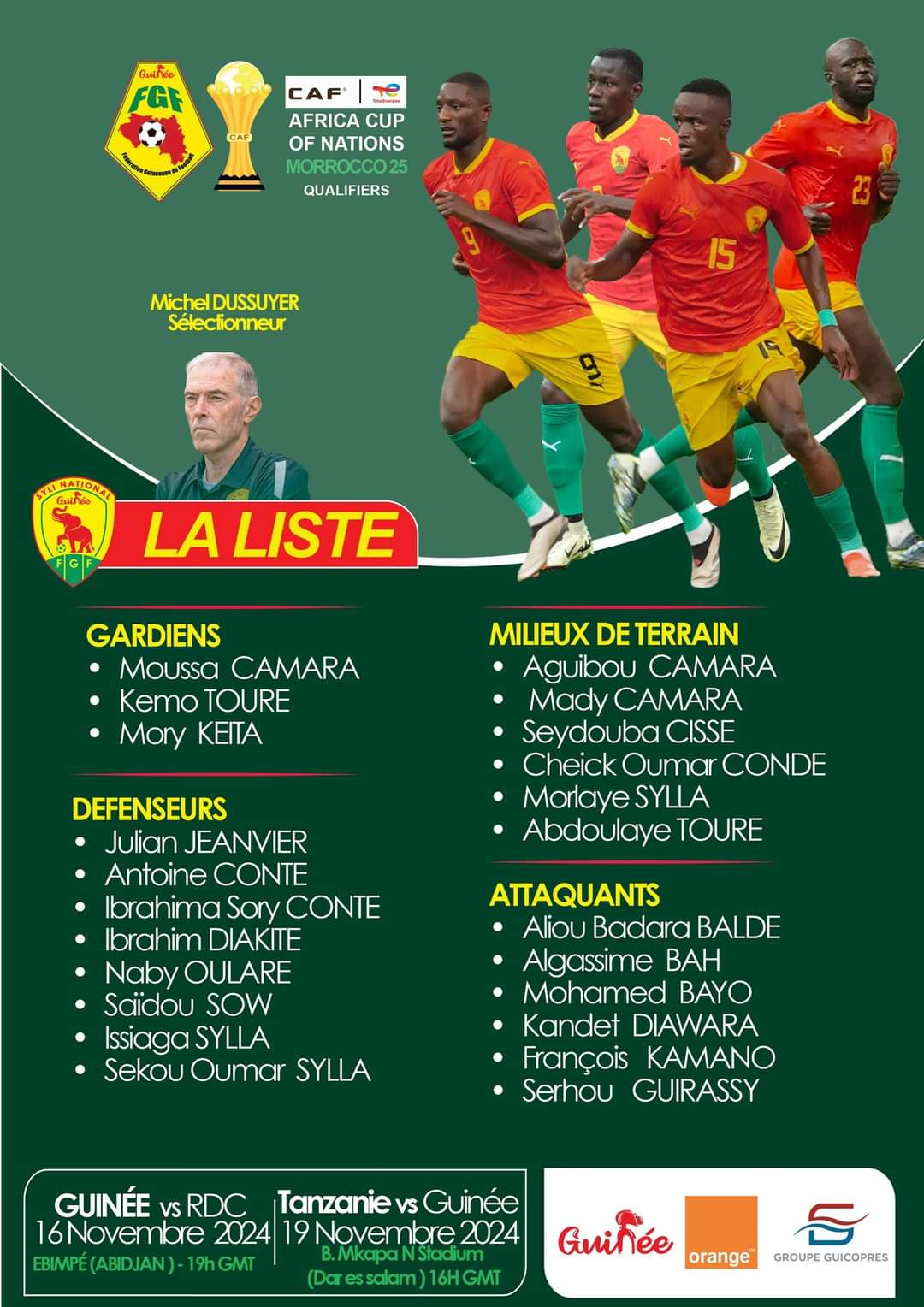 D’abord contre la RD Congo le 16 novembre 2024 au Stade Alhassane Ouattara Ebimpe au compte de la cinquième journée avant de se rendre à Dar-es Salam pour défier la Tanzanie le 19 novembre 2024 dans le cadre de la sixième et dernière journée de cette campagne de qualification. Pour ces deux matchs, le technicien du syli national a convoqué 23 joueurs. Dans cette liste, on note le retour de Julian Jeanvier et du gardien du Milo FC Kémo Touré, qui avait été écarté pour un problème administratif.