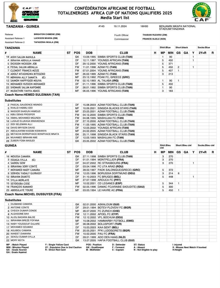 Si la requête est confirmée par la CAF, la Tanzanie risquerait donc une sanction et pourrait perdre ce match qui donnerait alors l’avantage à la Guinée. Pour le moment, les discussions et vérifications de l’identité du joueur incriminé se poursuivent au stade oû le Syli a été battu (1-0) par les Taifa Stars.