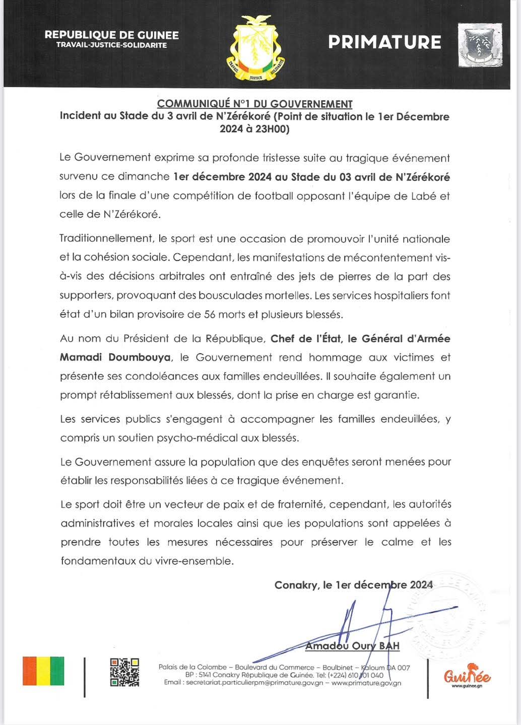 Avant la fin du match dotée du Trophée du président de la transition, le Général Mamady Doumbouya, des contestations liées aux décisions des arbitres ont causé des bousculades après des jets de projectiles, et l’utilisation du gaz lacrymogène par les forces de l’ordre a envenimé la situation. Dans la panique, les supporters ont escaladé les murs du stade, il y a eu des morts et des blessés. Selon un premier bilan annoncé par le gouvernement guinéen, on dénombre 56 morts et de nombreux blessés. Un bilan encore provisoire. Le gouvernement, qui a déjà restreint internet dans la localité, a pris plusieurs mesures pour :