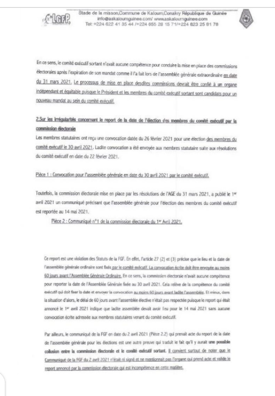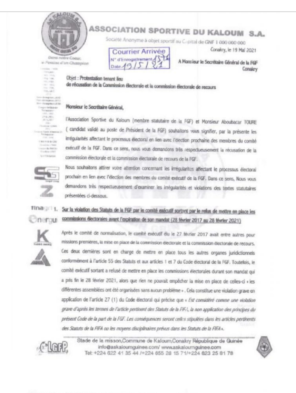 Dans un courrier adressé au secrétaire général de la Fédération guinéenne de football, ce mercredi 19 mai, le club de la presqu’ile de Kaloum, l’ASK, dit avoir relevé des irrégularités indiscutables qui pourraient affecter le processus électoral relatif au renouvellement prochain des instances du bureau exécutif. Conséquence: l’ASK demande simplement la récusation de la commission électorale et la commission électorale de recours. Ci dessous le courrier :