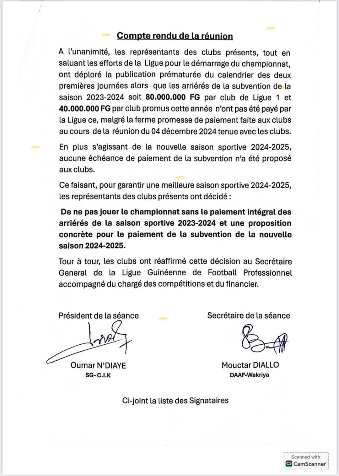 En cause, 12 des 14 clubs engagés dans cette compétition rejettent la proposition de la LGFP et font des exigences pour reprendre le chemin des stades. Parmi ces exigences, figure en bonne partie le versement intégral des arriérés de la subvention au titre de la saison dernière qui s’élève à 80 millions de francs guinéens, alors que la Ligue s’était engagée à payer juste la moitié. Sans cet argent au complet, ces 12 clubs signataires dont le Loubha, CI Kamsar, Milo, Wakriya, Horoya ASM Sangarédi, refusent de prendre part au championnat national de Ligue 1. Autre requête, ces clubs exigent une « proposition concrète de la Ligue pour le paiement de la subvention de la nouvelle saison ».