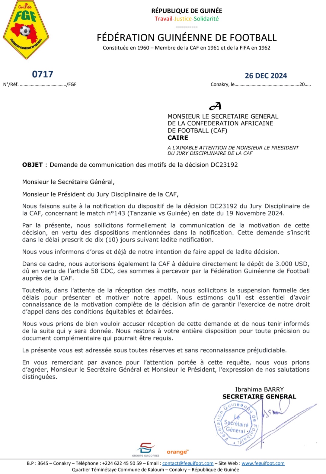 « Nous sollicitons la suspension formelle des délais pour présenter et motiver notre appel. Nous estimons qu’il est nécessaire d’avoir une motivation complète de la décision afin de garantir l’exercice de notre droit d’appel dans des conditions équitables et éclairées » estime la Féguifoot dans ce courrier transmis à la CAF.