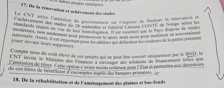 CONAKRY- Lors de l’examen et l’adoption de la section des dépenses du projet de loi de finances initiale pour l’exercice 2025, ce mardi 31 décembre 2024, le Conseil National de la Transition (CNT) a attiré l’attention des autorités sur la nécessité impérieuse d’achever les travaux de rénovation des stades du 28 Septembre et du Général Lansana Conté de Nongo, à Conakry.