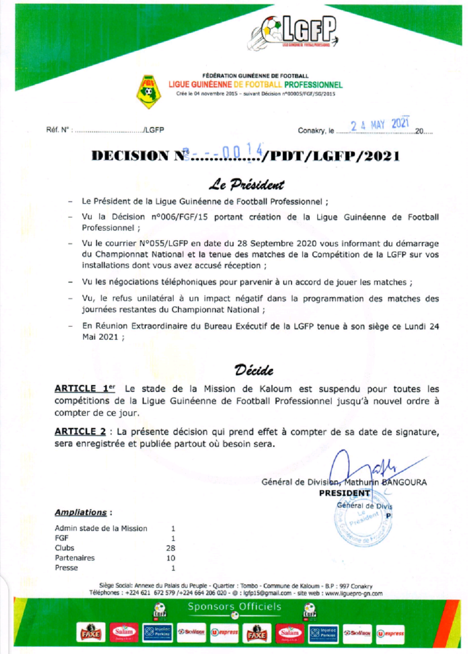 Suite au refus de jouer la rencontre du championnat de la ligue 2, qui devrait opposer le club FC kaloum de Mamadouba Blaise Camara et le Soumba de Dubréka le samedi, 22 mai, au stade de la Mission, la ligue guinéenne de football professionnel, à travers une décision vient de suspendre le stade dit stade (Stade de la Mission de kaloum) jusqu’à nouvel ordre.