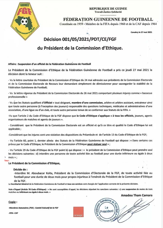 CONAKRY- Dans une décision publiée ce jeudi, la commission d’éthique dirigée par Amadou Tham Camara a annoncé la suspension du président de commission électorale de la fédération guinéennedeFootball.