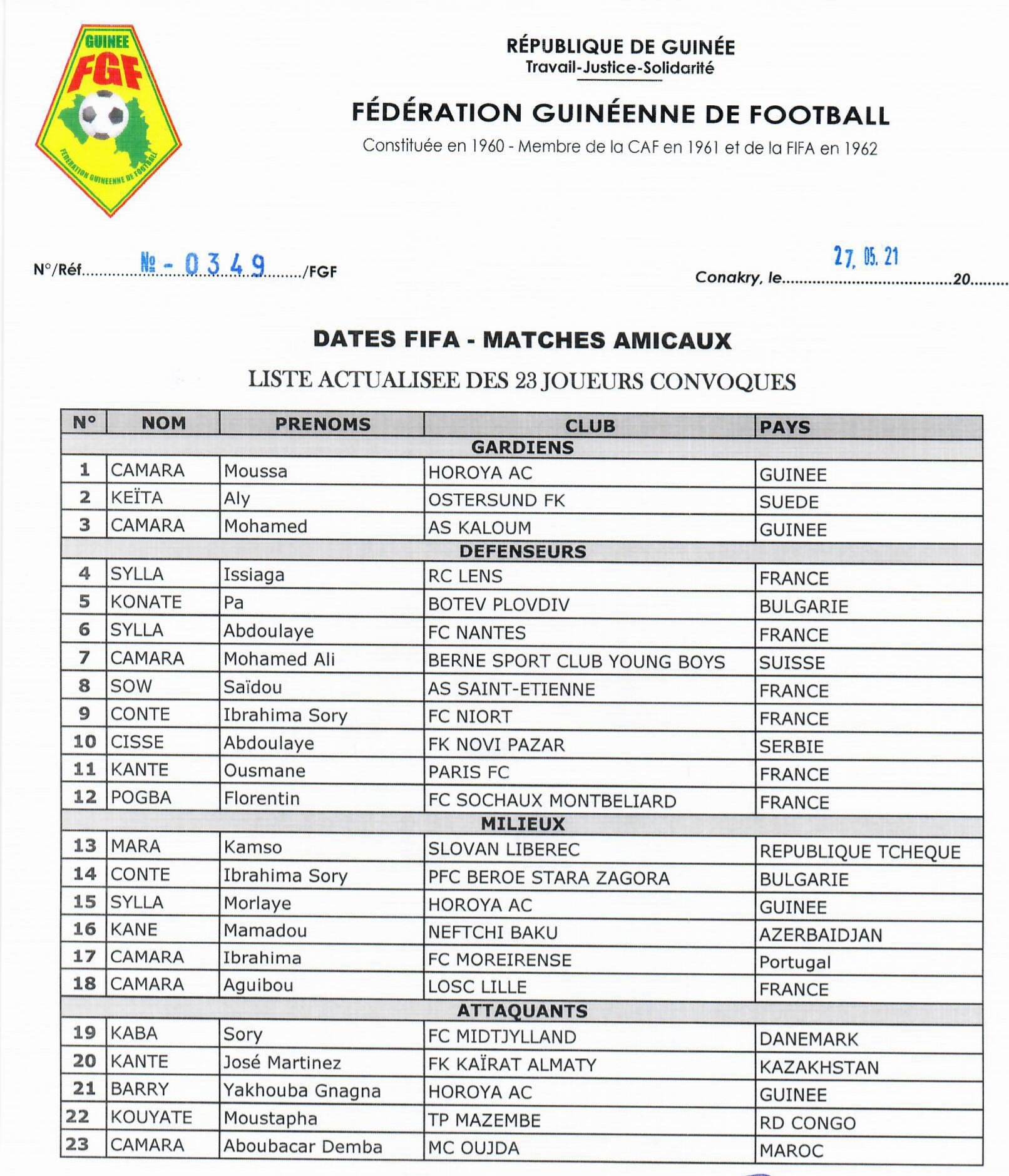 Voici la liste actualisée du Syli pour les 4 matches amicaux