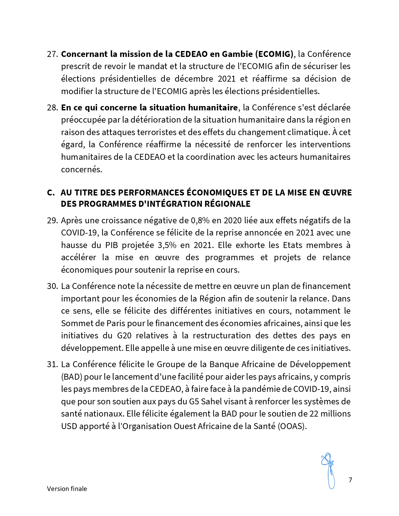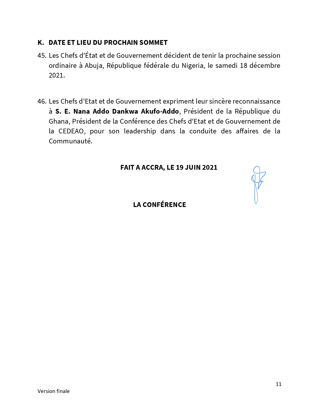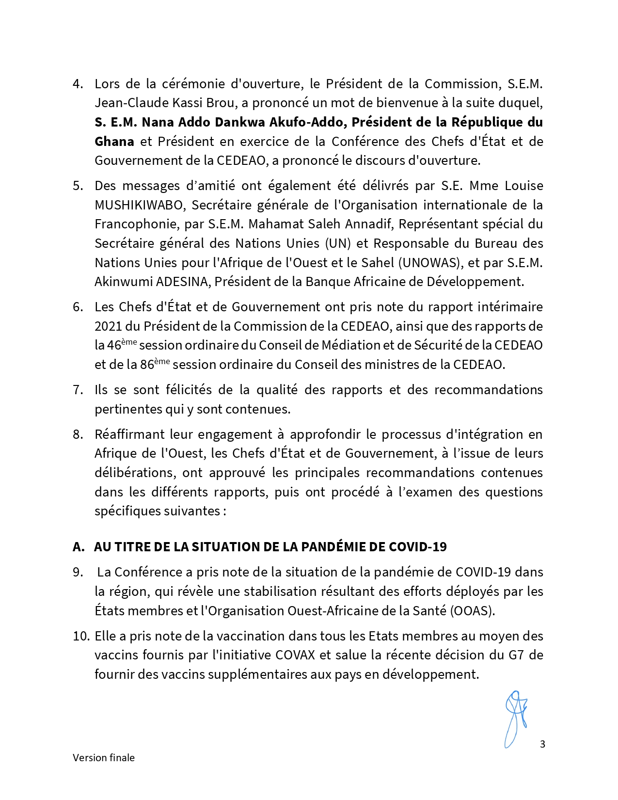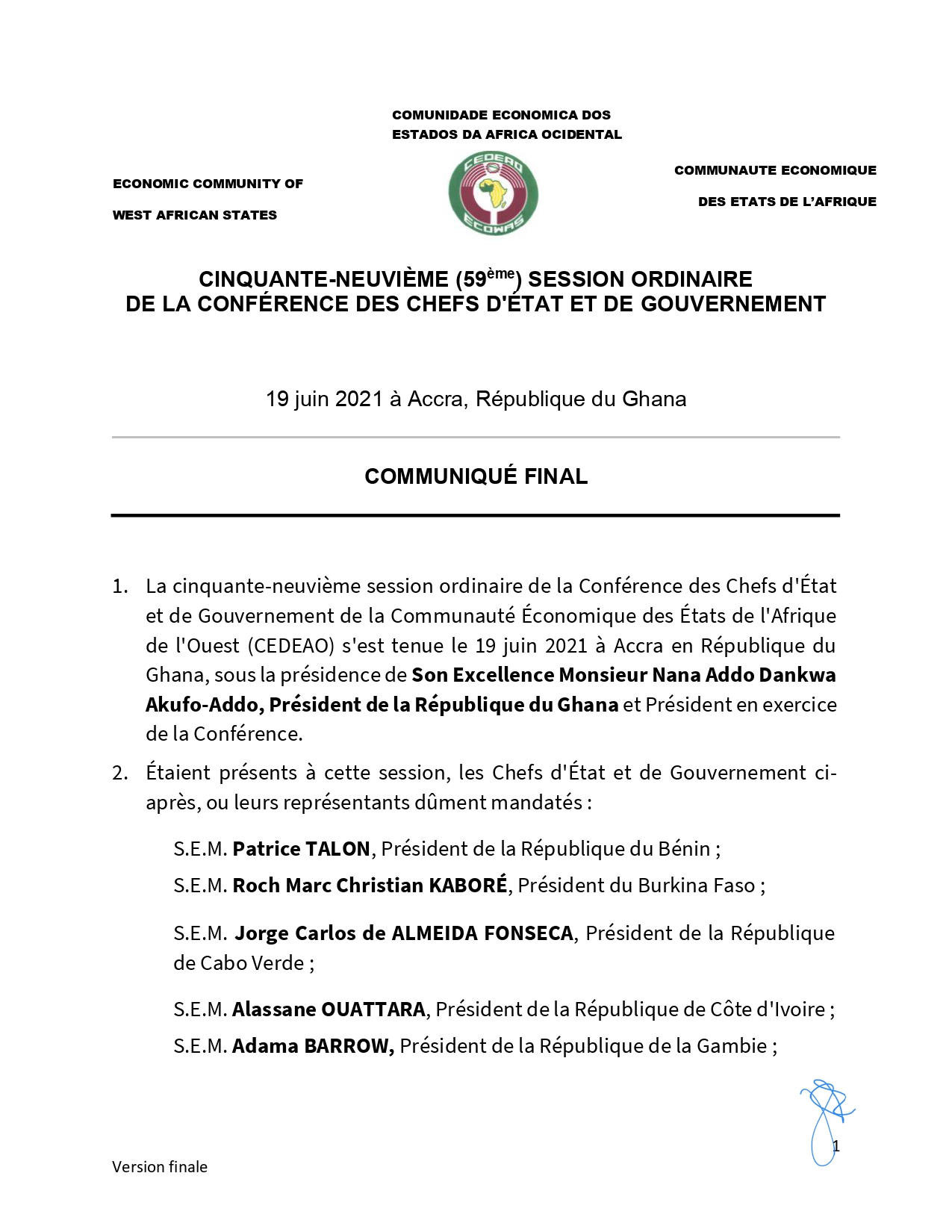 A l’invitation du président ghanéen Nana Akufo-Addo, les chefs d’État et de gouvernement de la Cedeao, réunis en session ordinaire à Accra, au Ghana, ont encouragé la Guinée et la Guinée-Bissau à œuvrer ensemble pour la réouverture de leur frontière. Communiqué final…